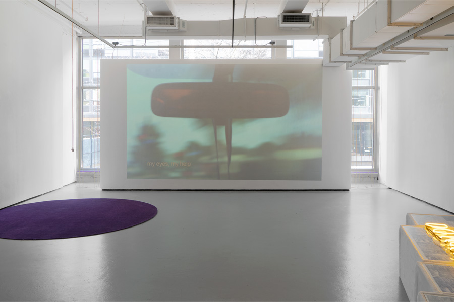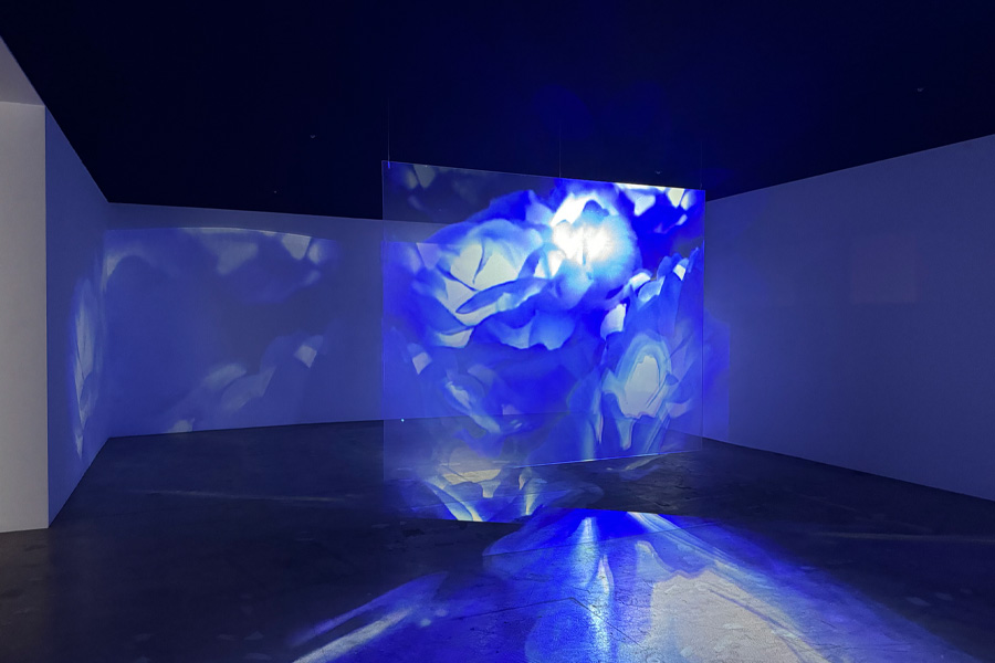 The piece features film captured on an ‘80s-era camcorder of the exterior wall of the Yongsan Garrison in Seoul, near where Mira grew up, which was the headquarters of the U.S. military presence in Korea until 2018. The second channel shows an inflatable rabbit she found inside the walls of the base. Projected on both sides of a holographic screen, the clarity and position of the images shift as the viewer moves through the room.