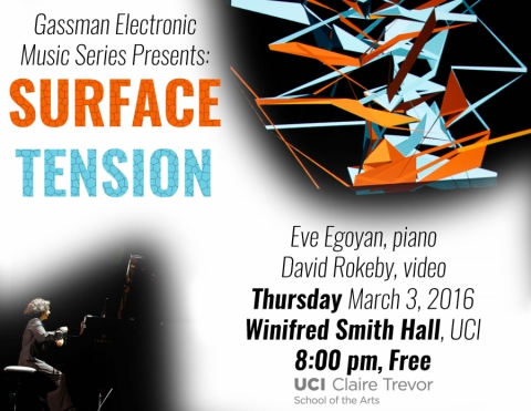 IRVINE, Calif. (February 23, 2016) - The Gassmann Electronic Music Studio in the Claire Trevor School of the Arts at UC Irvine presents Surface Tension, a concert by pianist Eve Egoyan and new media artist David Rokeby, Thursday, March 3, 2016 at 8:00 p.m. in Winifred Smith Hall on the UCI campus. The concert of works for piano and interactive video will present collaborative works in which image and sound are equal and integrated partners. Admission is free; no ticket is required.